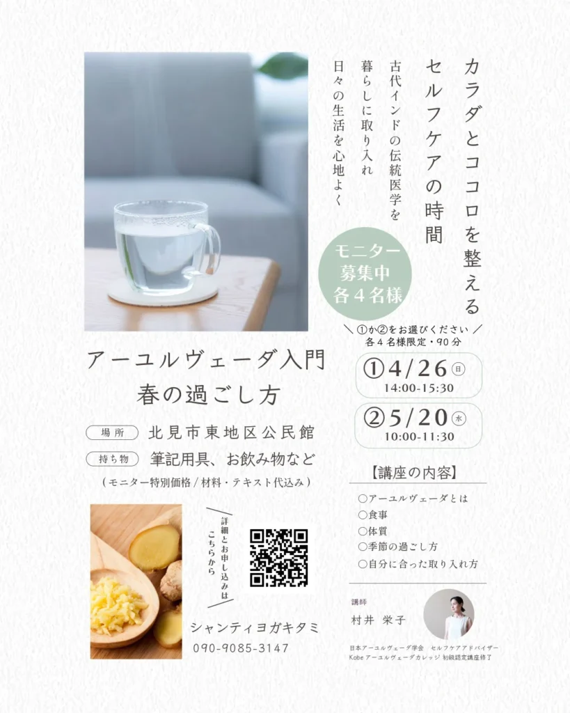 4/26(日)開催の「アーユルヴェーダセルフケア入門講座」もおかげさまで定員に達しました。